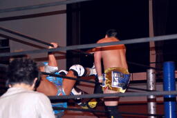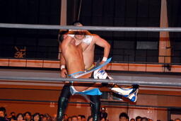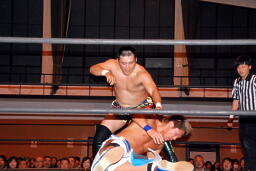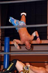 ロープを飛び越えて三角飛び式絶品(右写真)、カウント2。