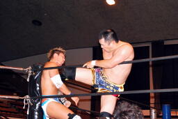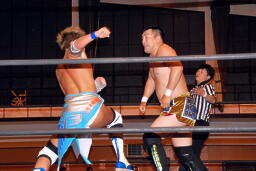 佐藤パンチ(左写真)、カニばさみからアキレス腱固め、大石ロープ。5分経過。