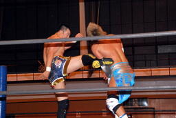 ミラクルエクスタシー狙うが佐藤はハイキックからバックドロップ(右写真)、カウント2。