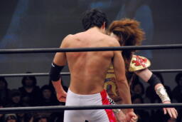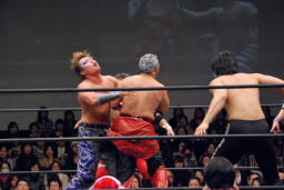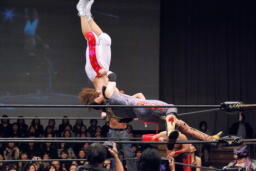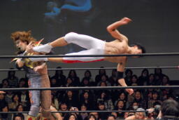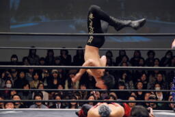 遠藤がムーンサルトプレス(右写真)。
