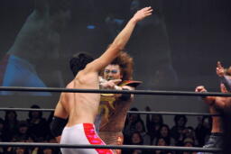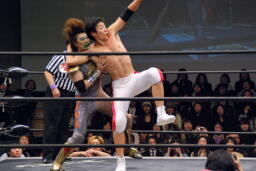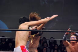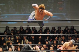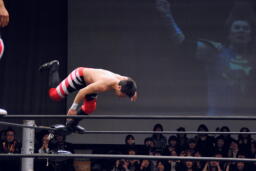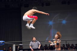 遠藤ロープに振ってバックエルボー、その場跳びシューティングスタープレス(右写真)、カウント2。