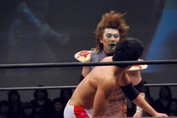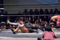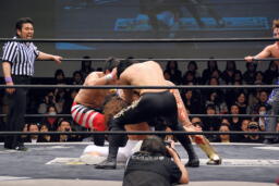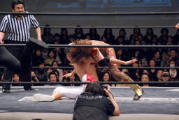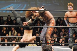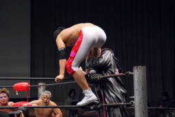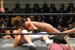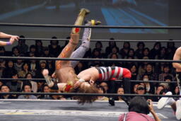 妻木がボディスラム、遠藤450°スプラッシュ(左写真)、しかしポイズンはグリーンミストでフォールをハネ返す。