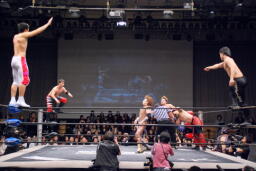 遠藤と妻木が多咬刺とJARASHIMAにドロップキック(左写真)、場外に。