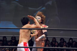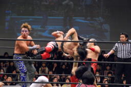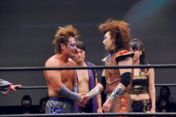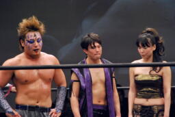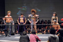若手3人は退場し、リング上には蛇界の5人(左写真)。