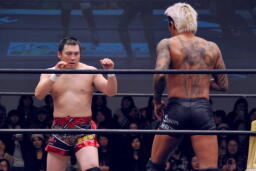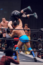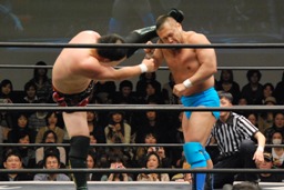 高梨フロントネックロック(右写真)、松野自軍コーナーに押し込んでウラノにタッチ。