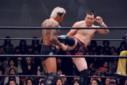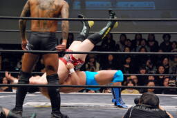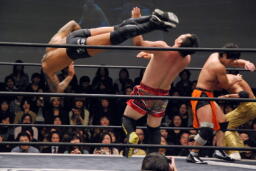高梨ロープに飛ぶ、ウラノフランケンシュタイナー(左写真)、待つのにタッチ。