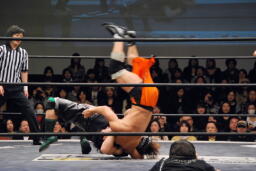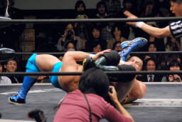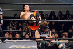 スナップスープレックス(右写真)、カウント2。
