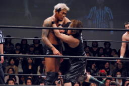佐藤三角絞め(左写真)、松永持ち上げてボムに。高梨入ってチンクラッシャー、