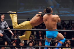 ゴージャススーパースターエルボー(左写真)、カウント2。