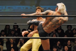 高梨首投げから後頭部にドロップキック(右写真)。