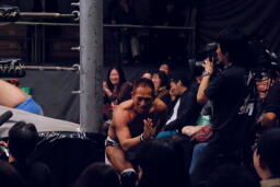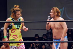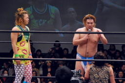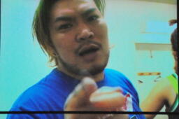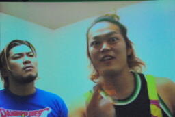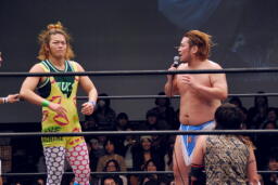 福田が隣にいるディーノに対しカメラの方を向いて「Mr.ゲイ、アンタに勝ってアンタ名義のユニットを作ってもらうぜ」と挑発(左写真)。