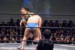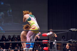コーナーに上ってファイヴスター・ダブルアックスハンドル(左写真)、カウント2。