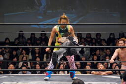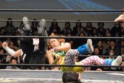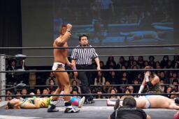 ニラがフォール、ディーノも漢固めの体勢(右写真)、カウント3。
