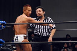 マイケル入るが松井レフェリーが戻す(右写真)。ニラはディーノにタッチ。