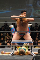 福田がニラにパーフェクトプレックス狙う、ディーノが後ろから股間をつかんで(左写真)、