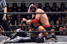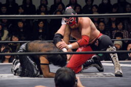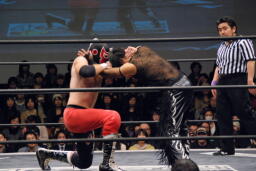 首投げから両腕を固めてフェースロック(右写真)、リリースしてエルボードロップ、カウント2。5分経過。