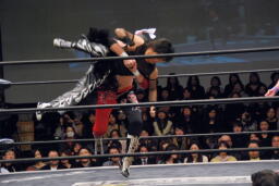 ジェネリコ背中にパンチ、MIKAMIはボディにパンチ連打(左写真)。
