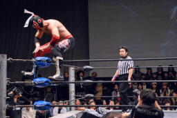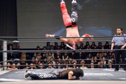 ジェネリコビッグブーツ、カウント2。ボディスラムからその場跳びムーンサルトプレス(左写真)、カウント2。