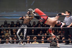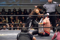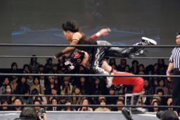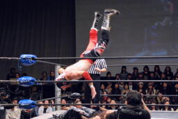 スワンダイブミサイルキック(右写真)、カウント2。10分経過。
