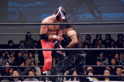 ジェネリコMIKAMIにキック、捕まえると場外半周(左写真)、リングに戻す。