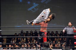 ジェネリコの上にラダーを乗せてダイビングセントーン(左写真)、カウント2。