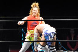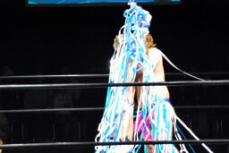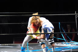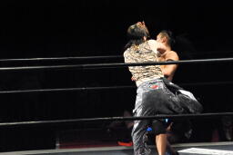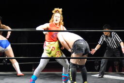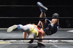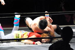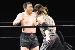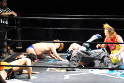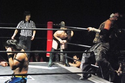 ニラ彰人をコーナーに振ってDJタイム、彰人かわしてニラは金具むき出しのターンバックルに激突(右写真)。彰人は佐藤にタッチ。