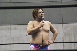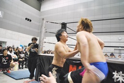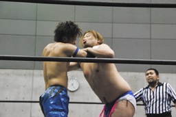 先発は遠藤とHANZO。HANZOソバット、遠藤かわす。ロックアップ、HANZOバック取る、遠藤腕を取る、HANZO切り返してアームドラッグ(左写真)。