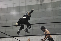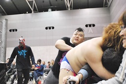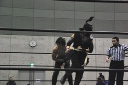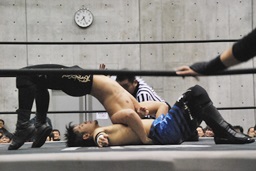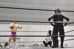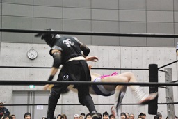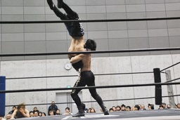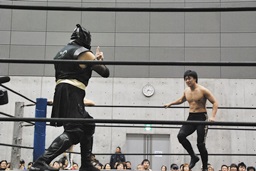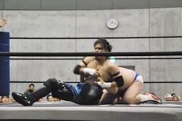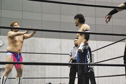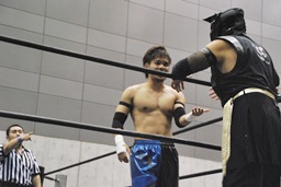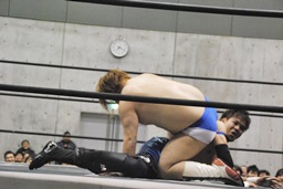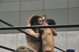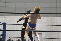 HANZO忍者ポーズ(右写真)。ロックアップ、HANZOフライングメイヤー、遠藤ヘッドシザーズで返す。遠藤フライングメイヤー、HANZOヘッドシザーズでブレーク。