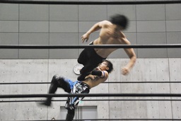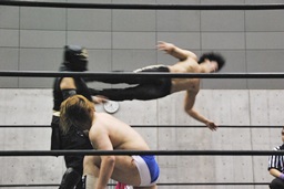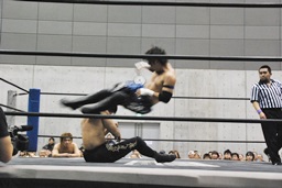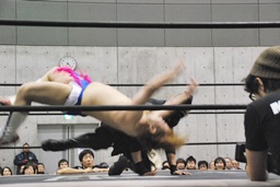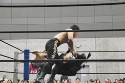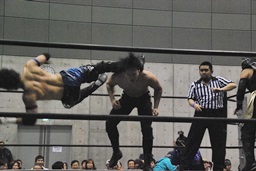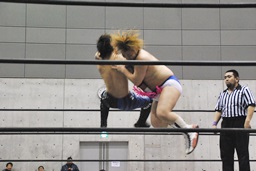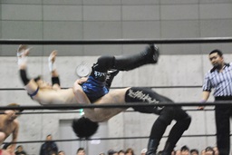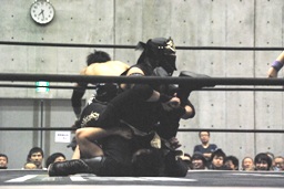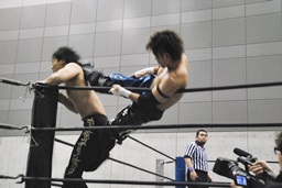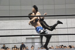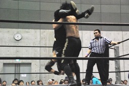コーナーに上ってムーンサルトプレス(左写真)、SEIKIかわしてドロップキック、HANZOにタッチ。