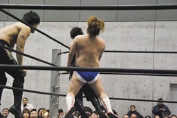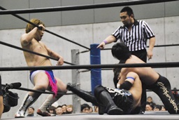 遠藤ボディスラム、ストンピング、ロープに振ってドロップキック(左写真)、カウント2。ディーノ「声出せー!ケツ出せー!」