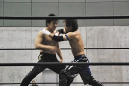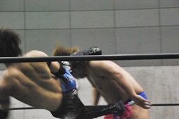 パンチとエルボーの打ち合いからエルボーと股間タッチ合戦に。ディーノロープに飛ぶ、SEIKIカウンターのゼロ戦キック(右写真)、HANZOにタッチ。