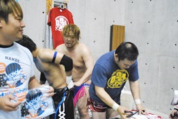両軍タッチ、だが、SEIKIはディーノの顔を見てコーナーに戻る(左写真)。HANZOはタッチ拒否。