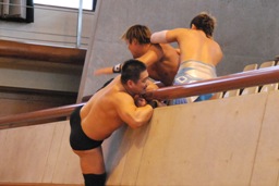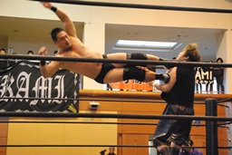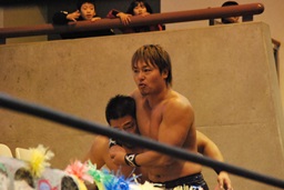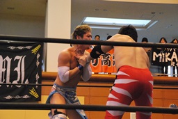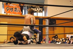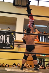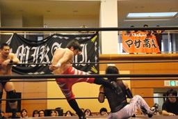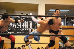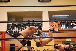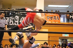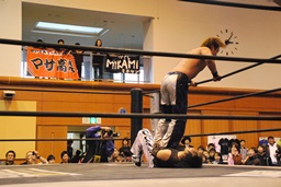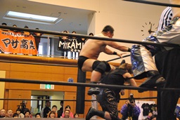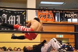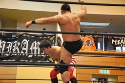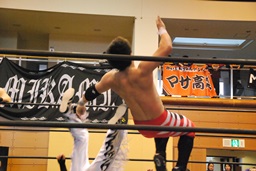 ウラノガットショット、腕をひねる(右写真)、MIKAMIロープを使って前宙、切り返してホイップ、ドロップキック。高木にタッチ。