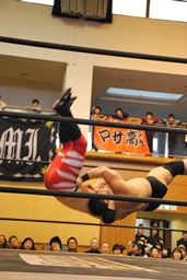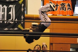 妻木MIKAMIの背中にパンチ、ボディスラムからエルボードロップ(右写真)、カウント2。