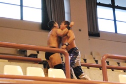 HARASHIMA中2階席で高木にヘッドロック(右写真)、