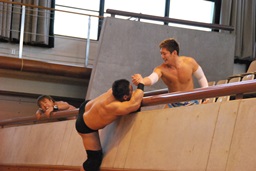ロープに固定してのヒップドロップ(右写真)。
