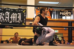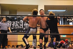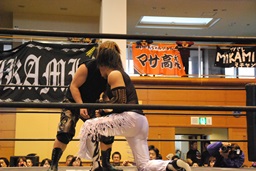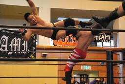 妻木バックドロップ、MIKAMI着地。妻木足を取る、MIKAMIキャッチ延髄、妻木かわすがMIKAMIはバックキック(左写真)、高木にタッチ。
