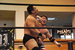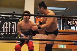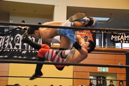MIKAMIロープに振る、ウラノ切り返す、MIKAMIコルバタ(右写真)、ウラノ場外転落。