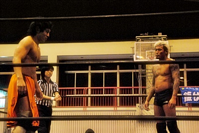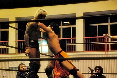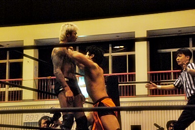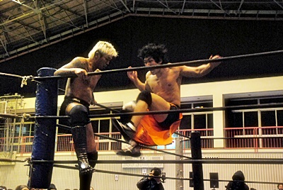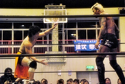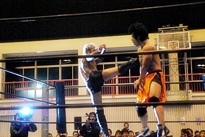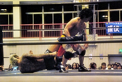 坂口チョップ(左写真)、高梨足にキック。