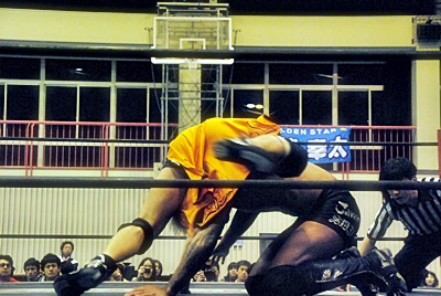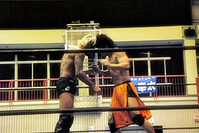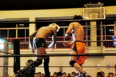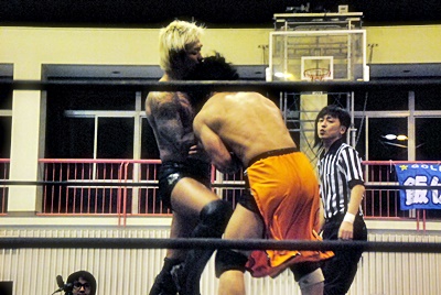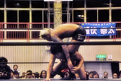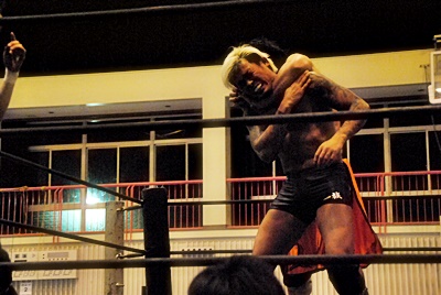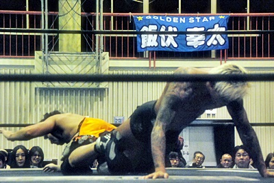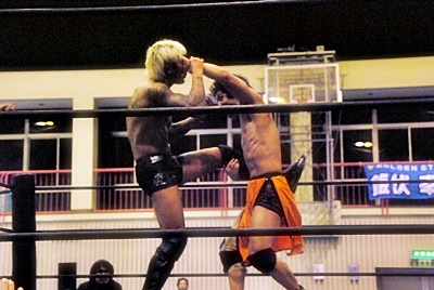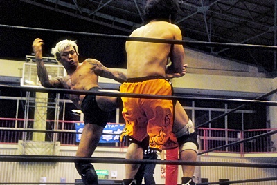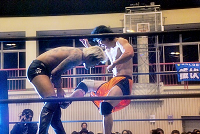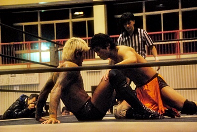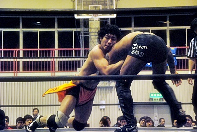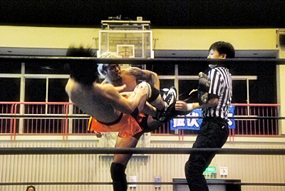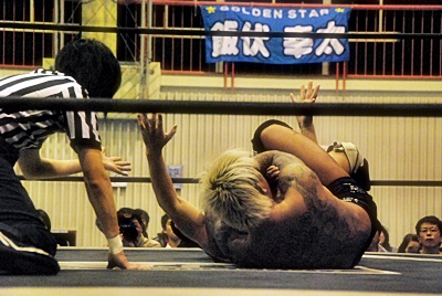 坂口ハイキック、高梨かわしてスクールボーイ(右写真)、カウント2。