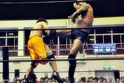 坂口ミドルキック(左写真)。