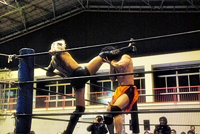 坂口ヒジでブレークしてミドルキック(左写真)。