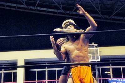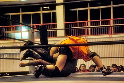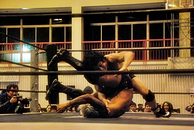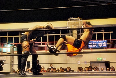 坂口はフロントネックロックに切り返す(左写真)、高梨ロープ。