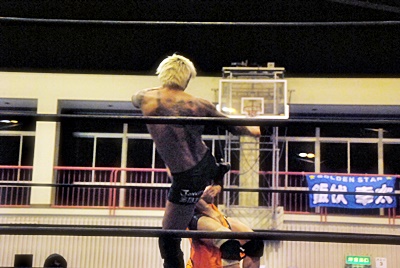 坂口コーナーに振って串刺しニーアタック、高梨かわす(右写真)、