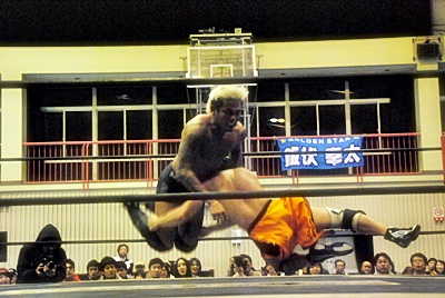 坂口ドロップキック(左写真)。
