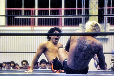 その足をロープに引っ掛けてドロップキック(右写真)。