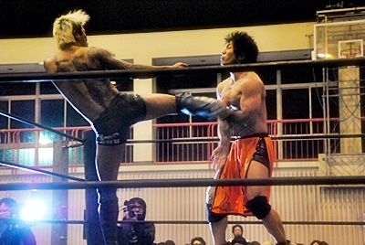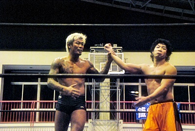 坂口チョップ、ミドルキック(左写真)、