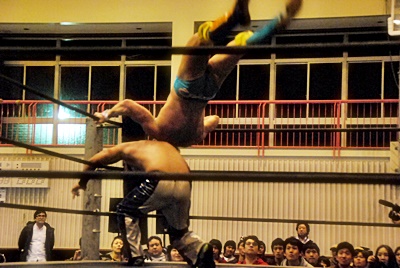 ロープに飛んでもう一発(右写真)、カバーはHARASHIMAがカット。