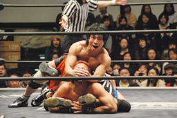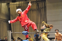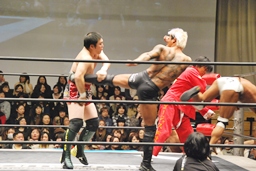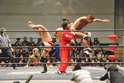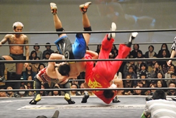 マイケル高梨にバックフリップ狙う、高梨ブロック。彰人が2人を飛び越えマイケルを回転エビ固め(左写真)、