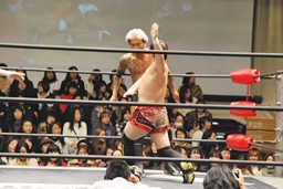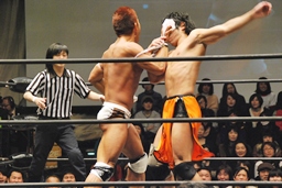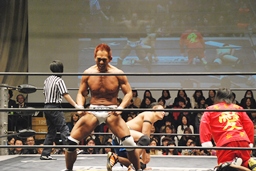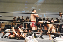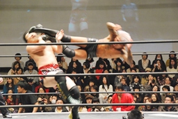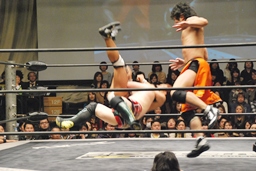 スワントーンボムは彰人かわして低空ドロップキック(右写真)。彰人「DDT!」と叫んでレッグブリーカー。